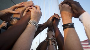 People of different races hold hands as they gather on the Arthur Ravenel Jr. bridge in Charleston November 14, 2017 stevenmsinger