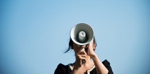 Businesswoman shouting through the megaphone in the open air.